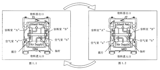 There are two fixed - diaphragm shaft, one at each end. When compressed air is supplied to the air chamber B (right, as shown in Figure 1.1), the shaft moves to the right, let the material feeding chamber B is extruded, while being sucked into a material containing a chamber.
